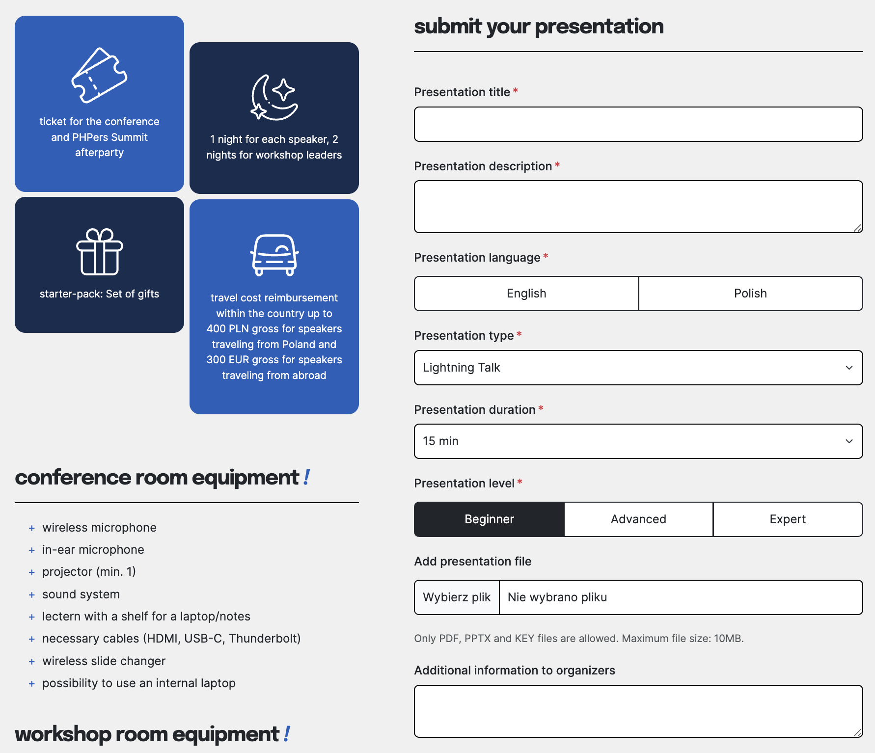 Even though there are popular apps specifically designed to manage speakers’ profiles and their talks like Sessionize, they all ship extra subscription costs. PHPers Summit organizers preferred to spend their funds once and for good and ordered us to build an extensive Call for Papers form and review UI, including speaker’s data, abstract, suggested talk duration, type, and other preferences