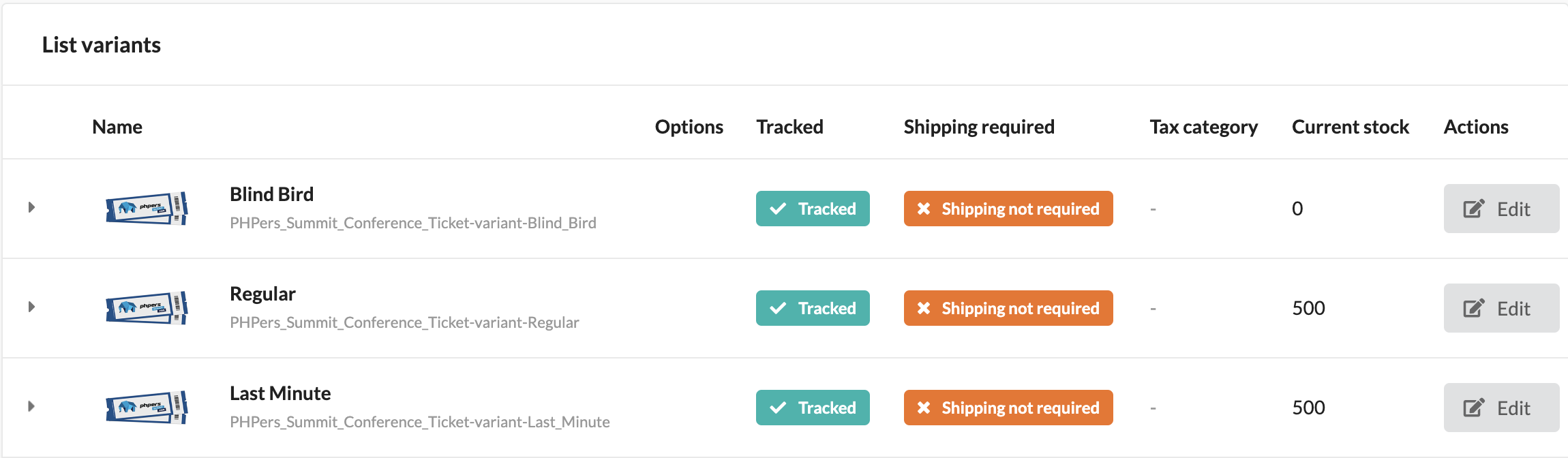Variants are crucial because they reflect the ticket types. If you have ever followed any conference or festival, you must be familiar with typical sales stages like “early bird”, “regular”, and “late bird”. PHPers Summit 2024 was no different. The limits are set thanks to the default inventory tracking definable in Sylius, and so are the availability dates.