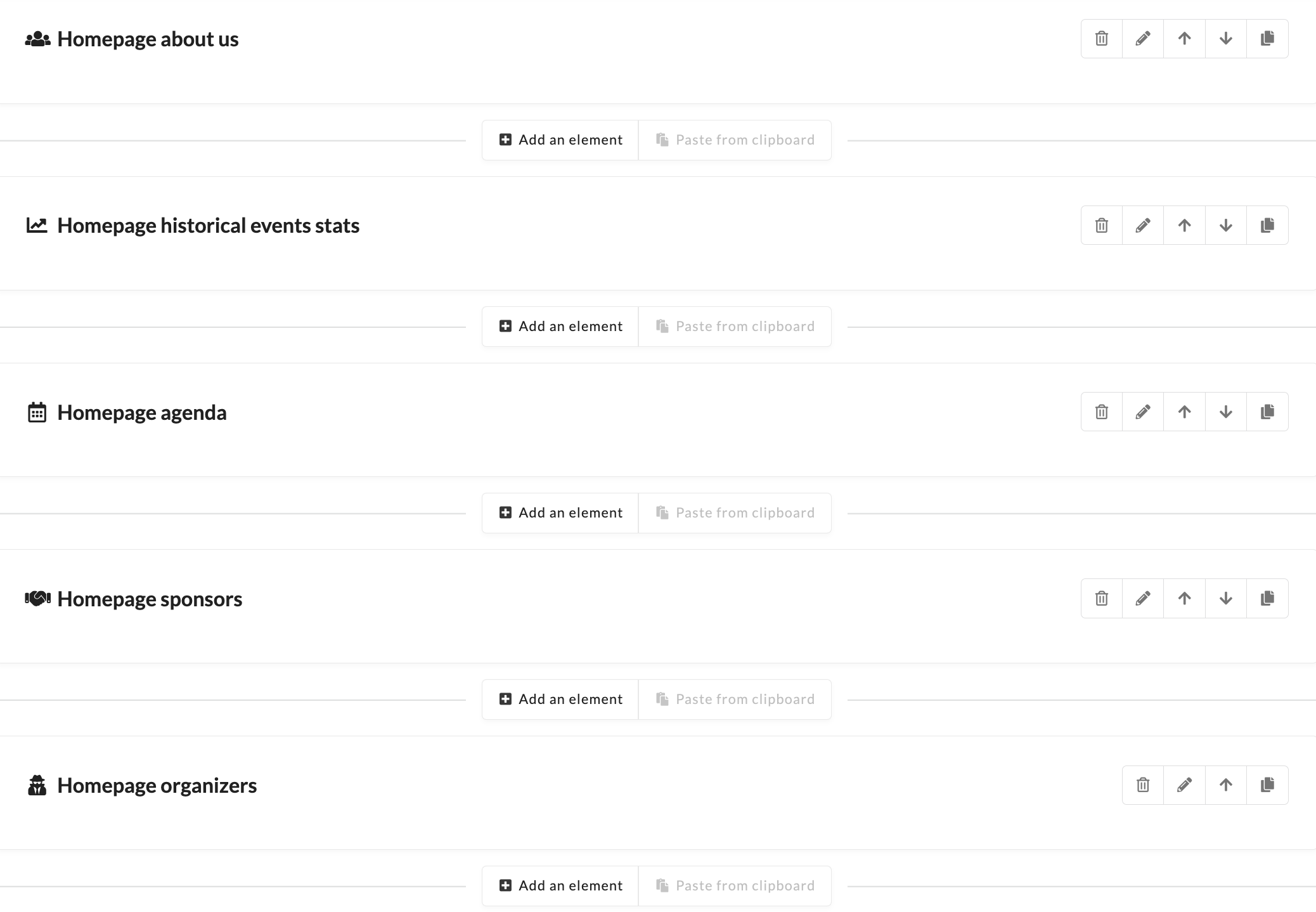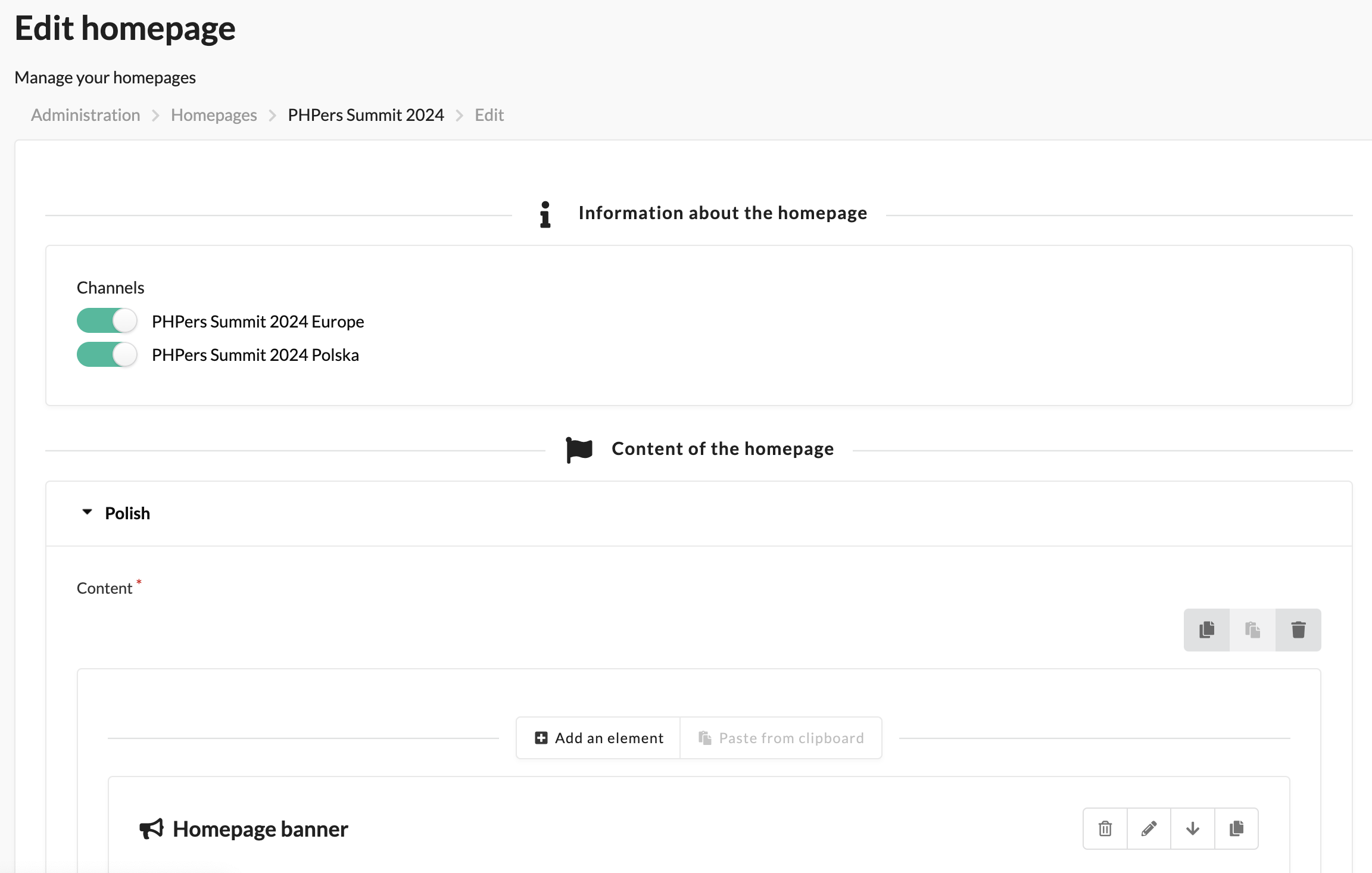 For a conference website to be attractive and provide all necessary information, content management is inevitable. Unluckily, Sylius doesn’t ship with a default CMS. There are several community extensions to fulfill this niche though. After thorough analysis, we decided to bet on Monsieur Biz’s Rich Editor and CMS plugins, providing intuitive UI elements to choose from when arranging your page.
