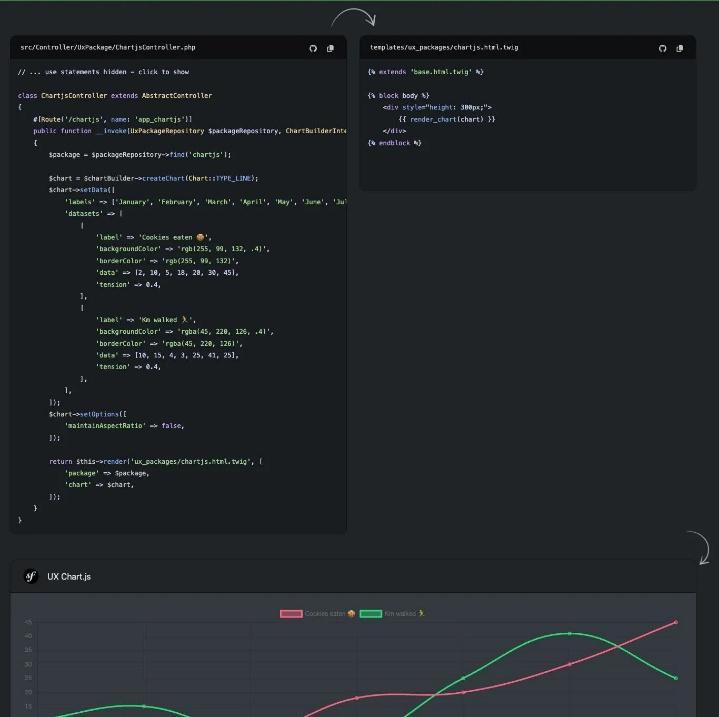Moreover, Symfony UX takes this integration to a higher level. Instead of writing the data-controller="..." manually, it provides Twig functions like render_chart(...). So, rendering a chart is as simple as you might see on the example below.